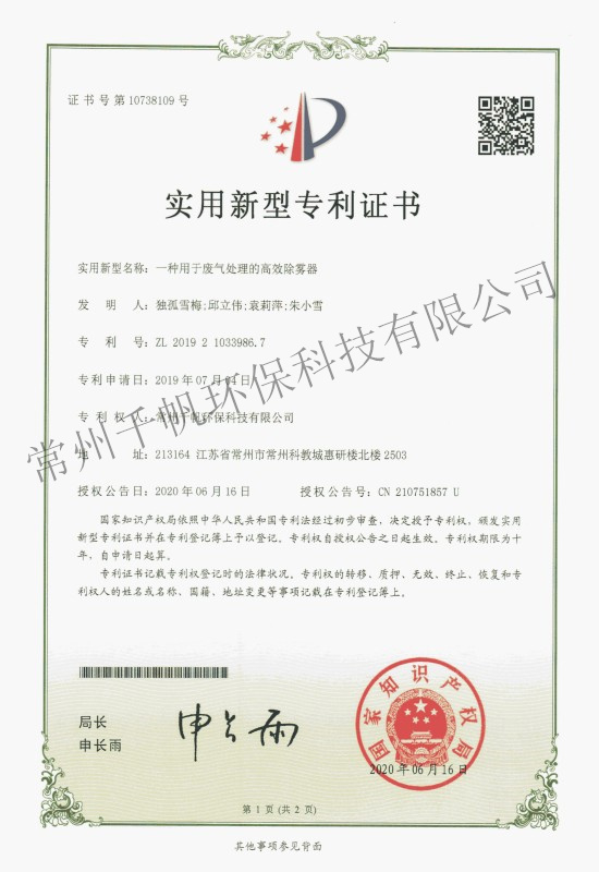 實(shí)用新型專利證書 一種用于廢氣處理的高效除霧器